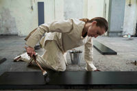 In “Tares”, two modes of artistic creation collide: the initially constructive phase, characterized by meticulous preparation and care of an image, followed by a destructive act. The artwork emerges from the interplay of both processes, which also subtly reference interpersonal relationships. The deliberately chosen linen costume places Emslander on the same material plane as the canvases she works on during the performance.